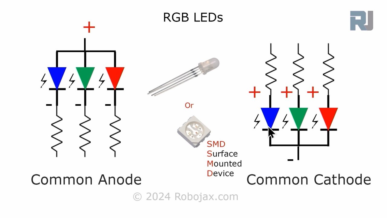 The RGB LED operates on a common anode or common cathode principle, which means that the anode (positive) or cathode (negative) of the individual LEDs must be connected properly for them to work. Each color can be controlled using Pulse Width Modulation (PWM), which adjusts the brightness of each LED by varying the duty cycle.