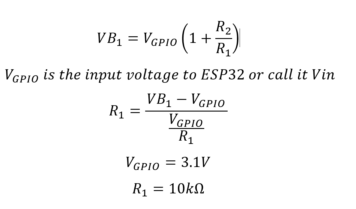 In this setup, one resistor, R1, is fixed at 10kΩ, while the second resistor, R2, can vary depending on the maximum voltage you wish to measure. The voltage across R1 is what we will read using the ESP32's analog input pin, allowing us to calculate the original voltage from the power source.