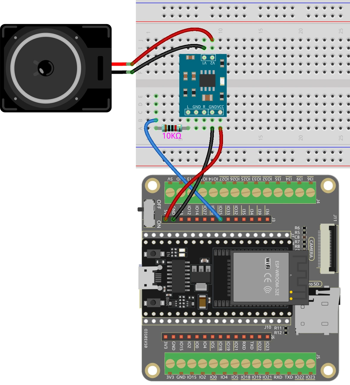 To wire the components together, start by connecting the power supply. Connect the 5 V from the ESP32 to the VCC pin of the audio amplifier. Next, connect the ground pin from the ESP32 to the ground pin of the amplifier. The audio output pin from the ESP32, usually GPIO25, should be connected to the input pin of the amplifier through a 10 kΩ resistor.