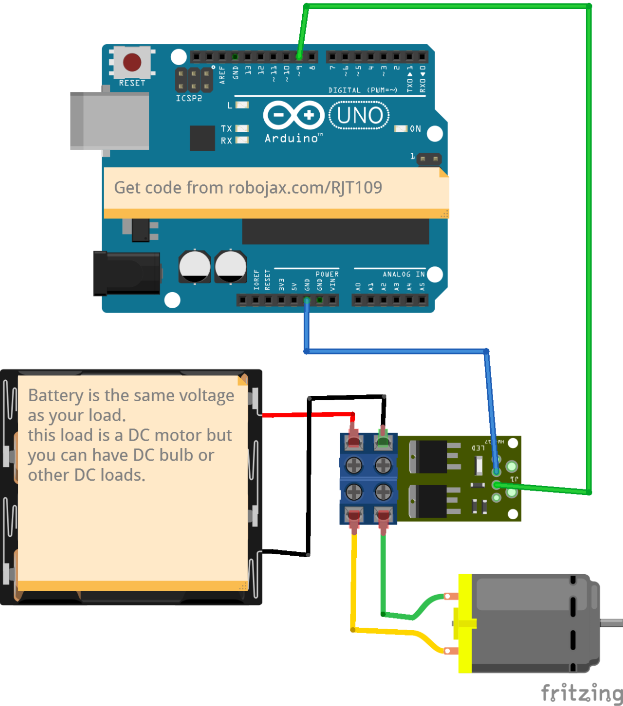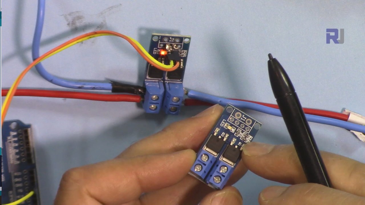 该模块有清晰标记的接线端子:输入(V在), 输出,和接地(视频中的 01:42)。将电源的正极连接到 V在,负极接地。你的负载连接到输出端子。Arduino通过一个数字引脚控制MOSFET模块的门(视频中在08:26)。