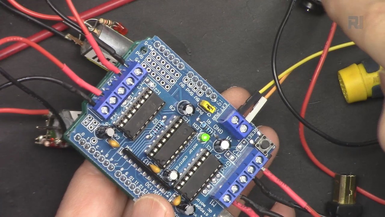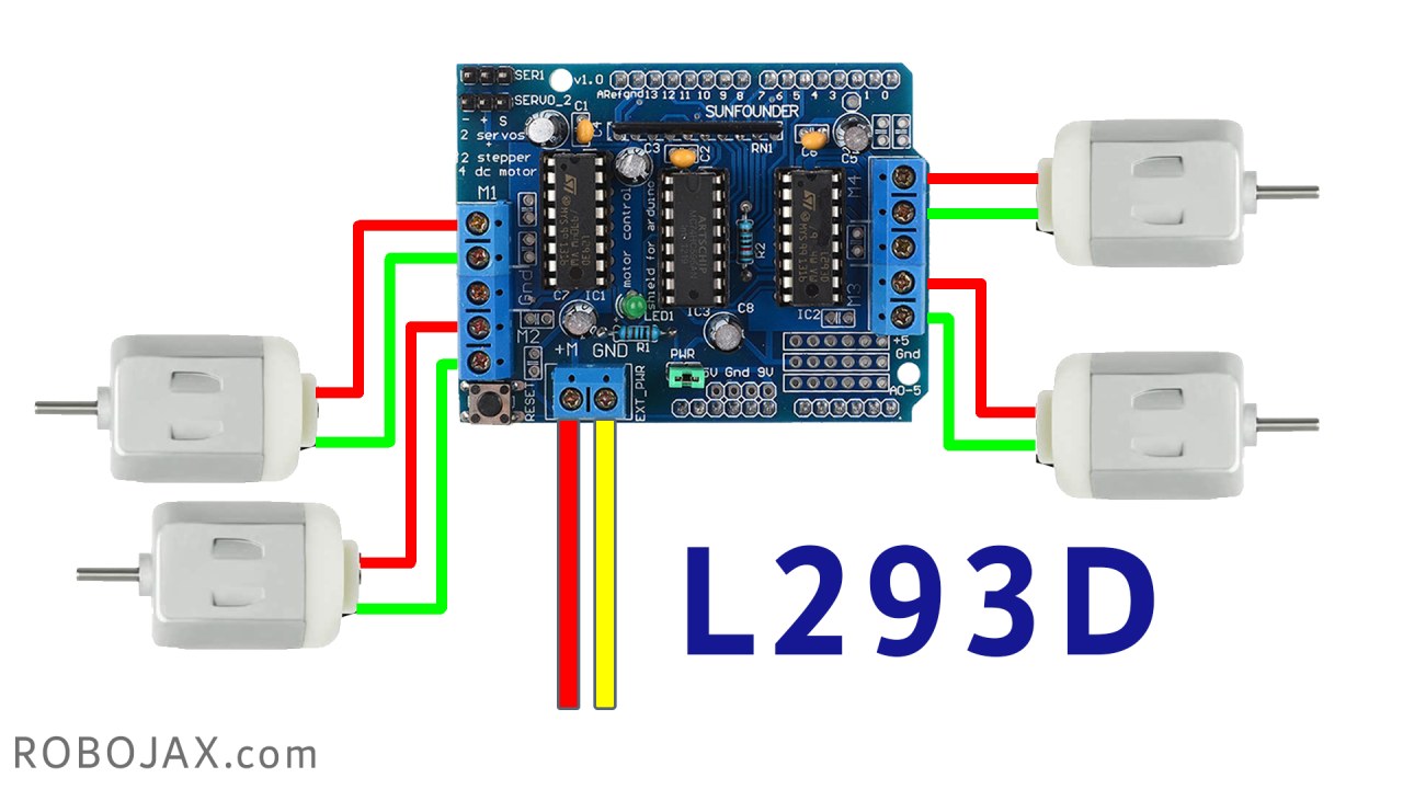 该项目的主要组件是 L293D 电机扩展板,它是一个四个半 H 桥电机驱动器。这意味着它可以在两个方向上控制两个电机,从而实现对电机旋转的完全控制。该扩展板直接连接到 Arduino,使得管理电源和控制信号变得简单而无需杂乱的布线。