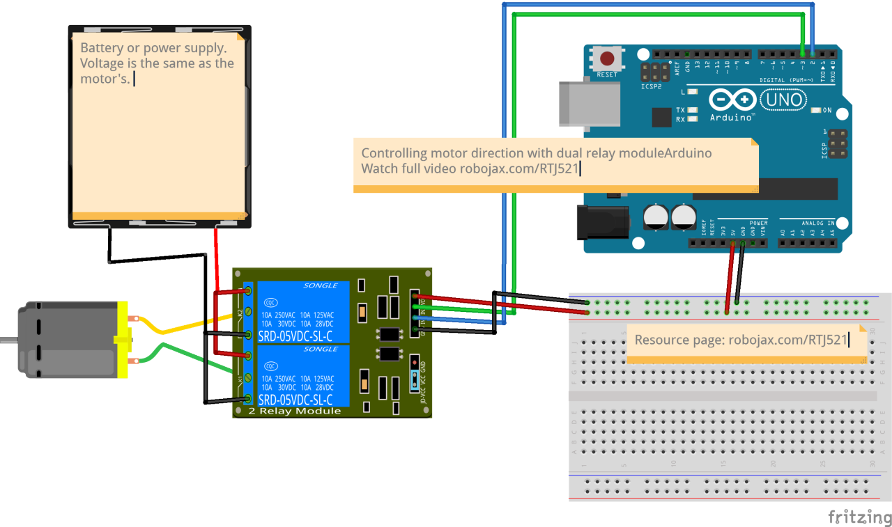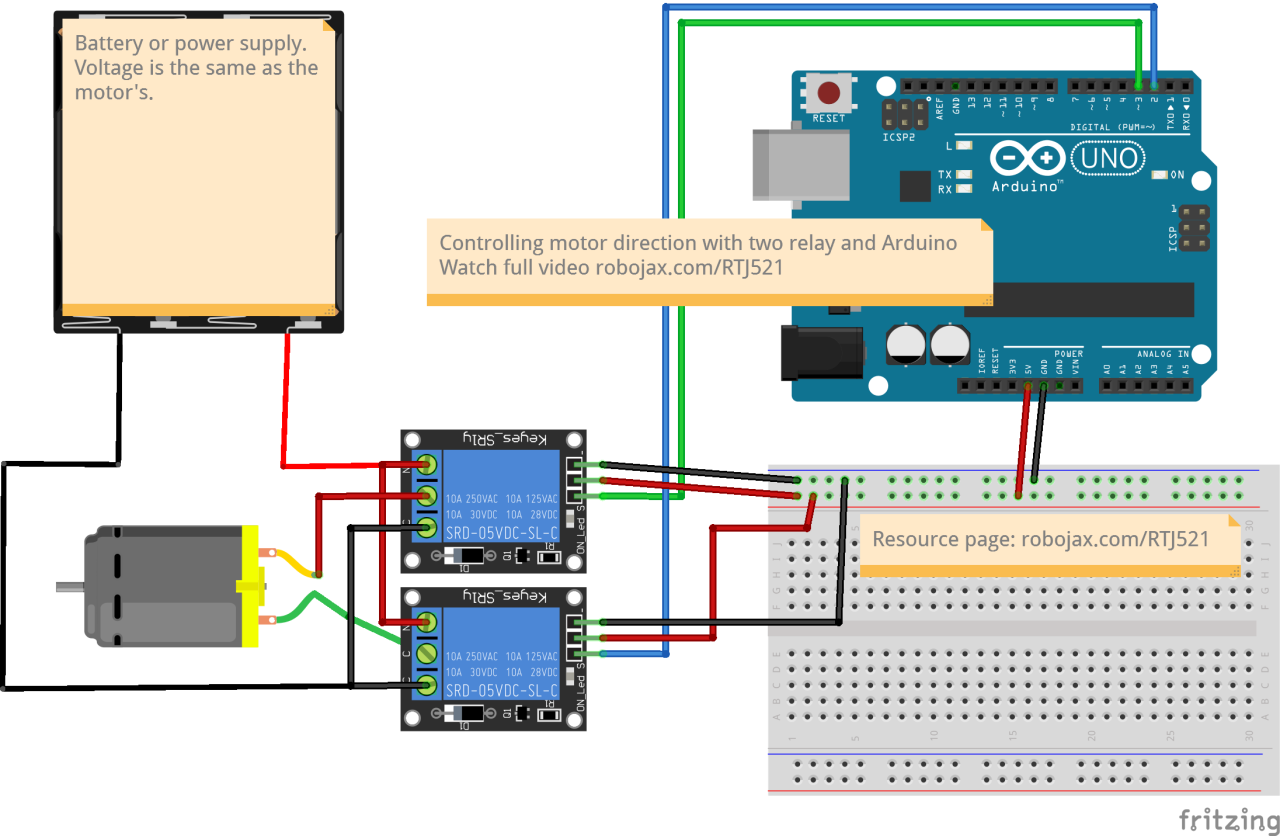 In questo tutorial, useremo due relè per cambiare la polarità dell'alimentazione al motore. Quando un relè è attivato, consente al corrente di fluire in una direzione, facendo ruotare il motore in un senso. Quando l'altro relè è attivato, inverte il flusso di corrente, causando la rotazione del motore nella direzione opposta. I relè agiscono come interruttori controllati dall'Arduino.