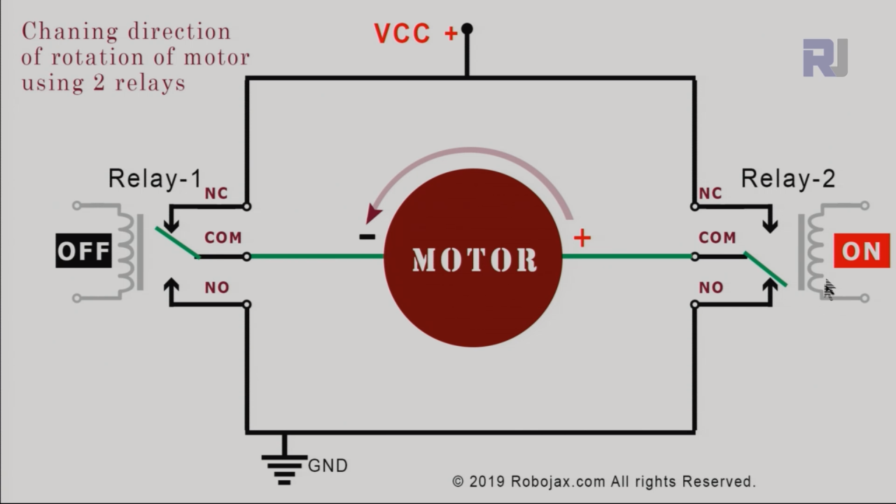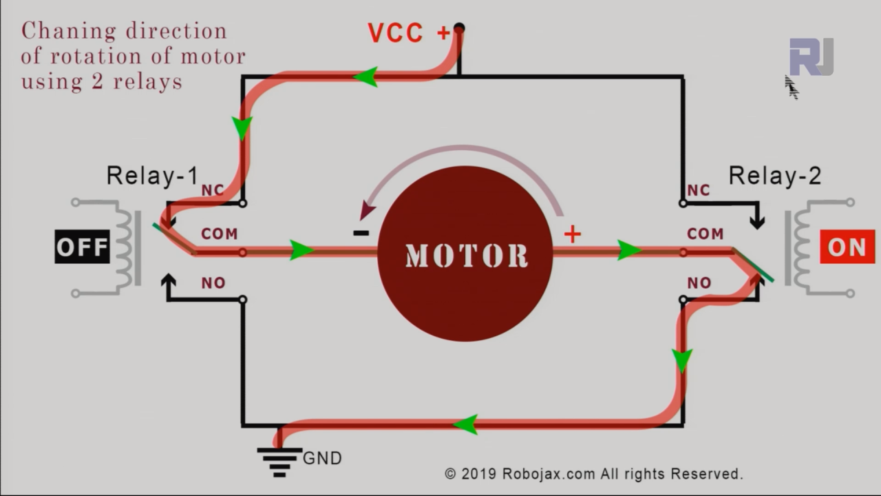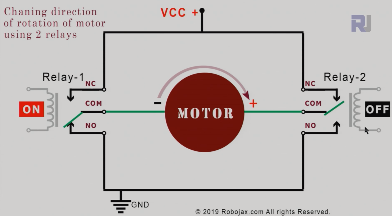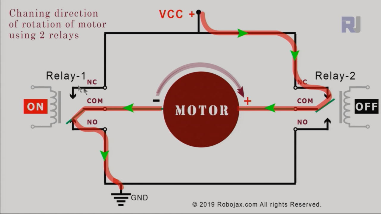 possiamo collegare due relè come mostrato sopra per controllare la direzione di rotazione del motore. Relè-1 se OFF e Relè-2 se ON. ora il motore ruota in direzione CCW. Guarda la freccia sopra il motore.