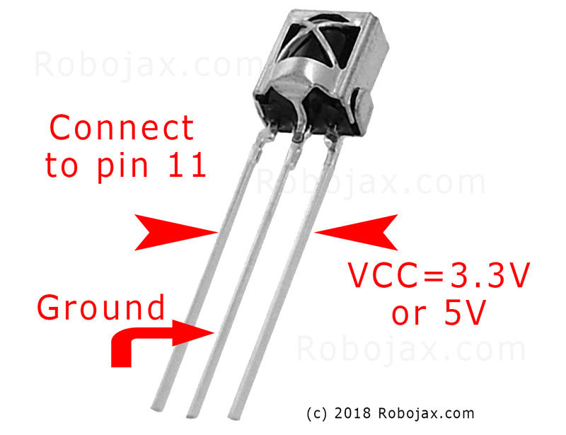 Receiver:The receiver has the model HX1838 or VS1838B either on PCB or without PCB. In both cases you will see them with 3 pins. Please watch video for instruction