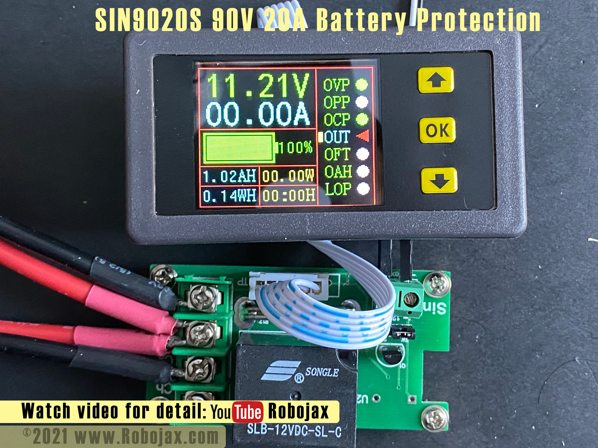 The ultimate battery protection module. SIN9020S has color display that can measure 20A current and voltage up to 90V. a 40A relay is used to disconnect the battery when OverCurrent protection, OverVoltage protection, OverPower protection, underVoltage protection overTime protection and OverCapacity protection is triggered. Please watch the video for details and how to set them. Purchase this from AliExpress