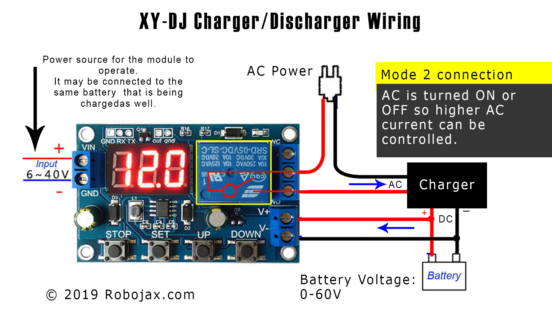 This XY-DJ can be also powred up by the same battery if the voltage of the batter is 6V to 60V.